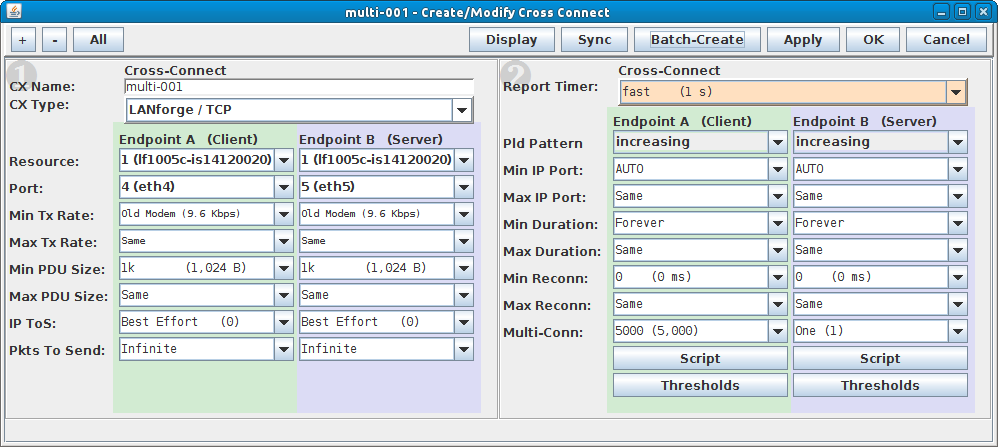 | As of LANforge release version 5.1.4, LANforge-FIRE has the capability to create multiple thousands of TCP connections using only two ports on one Layer-3 connection that can all run simultaneously and in a stateful manner. This feature can be used to test connection state aware devices such as firewalls, stateful packet inspection systems and intrusion detection/prevention systems. The upper limit of the total number of concurrent connections is determined by the processor speed and total memory available on the system running the LANforge software. In addition, the packet rate and payload size of each connection will also affect performance. NOTE: If you are attempting to run this test scenario, you will need a LANforge license key that enables the correct number of multi-connections. Please contact us at support@candelatech.com for assistance. |